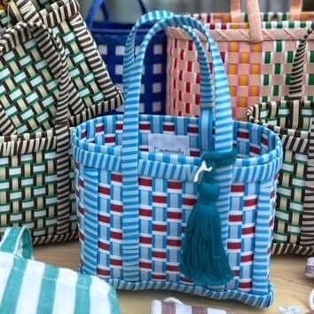 カラフルなプラスティックテープでしっかりと編まれたバスケットは、軽くて気軽に持ち歩くことができ、また壊れにくいのが魅力です。
