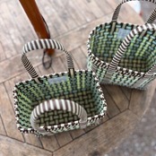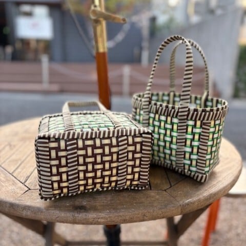 カラフルなプラスティックテープでしっかりと編まれたバスケットは、軽くて気軽に持ち歩くことができ、また壊れにくいのが魅力です。