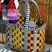 カラフルなプラスティックテープでしっかりと編まれたバスケットは、軽くて気軽に持ち歩くことができ、また壊れにくいのが魅力です。